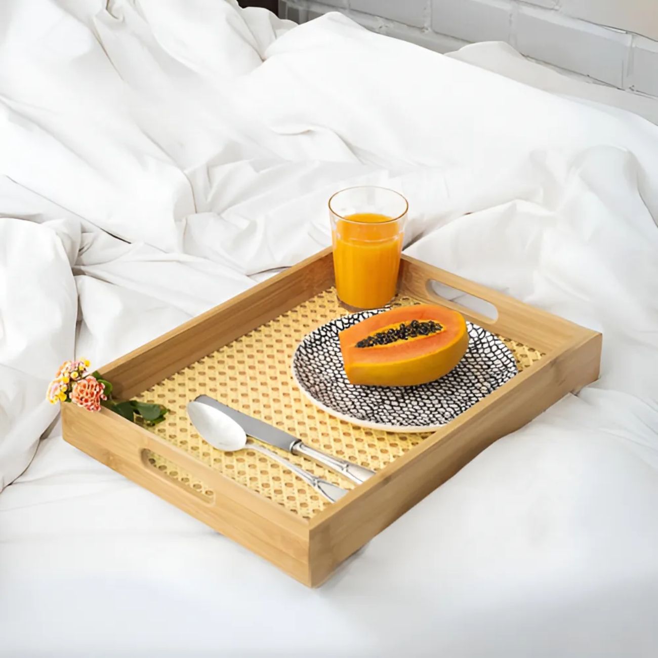 A Bandeja Retangular de Bambu com Detalhes em Rattan é uma peça versátil e elegante, ideal para quem busca unir funcionalidade e decoração em um único produto.