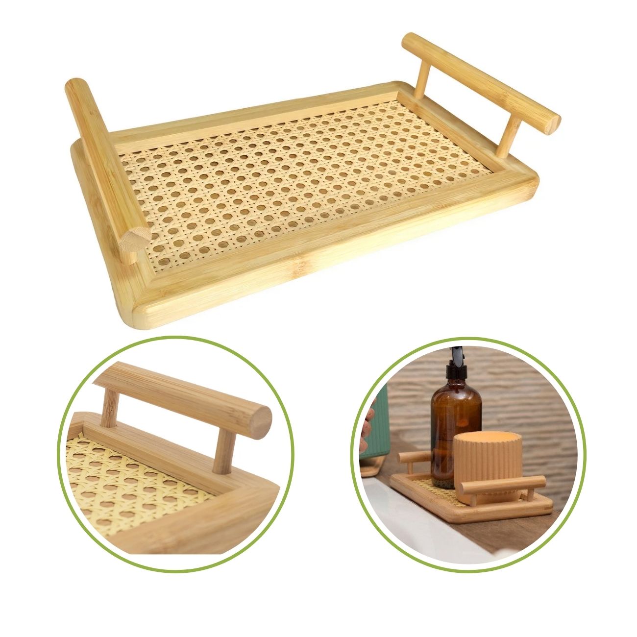 Produzida em bambu natural com revestimento em rattan, a bandeja apresenta tonalidade nude e detalhes em treliças que valorizam qualquer ambiente, como sala, quarto, banheiro ou cozinha.